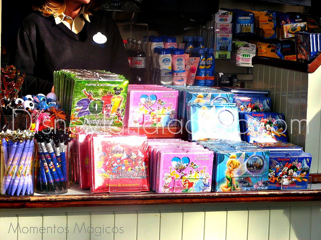 Hay muchos puestos como este donde puedes comprar libretas para recibir los autógrafos de tus personajes favoritos de Disney que te encuentres por las calles tanto de Disneylandia como de Disney California Adventure.